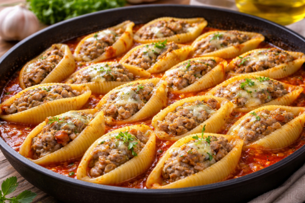 Когда нет времени долго стоять у плиты, выручает этот простой рецепт. Крупные макароны-ракушки сразу начиняются фаршем и готовятся прямо на сковороде в ароматном соусе. Макароны становятся мягкими, фарш сочным, а ужин получается сытным и очень вкусным.