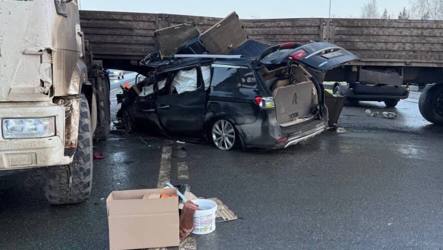 На фото видны последствия столкновения KIA Carnival с «КамАЗом» с полуприцепом на трассе «Набережные Челны — Заинск — Альметьевск».