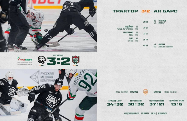 В первом периоде ворота обеих команд остались «сухими», роковым для «барсов» стал второй период — они пропустили три шайбы за 10 минут (при этом забили всего одну). В третьем периоде надежду гостям дал гол Митчелла Миллера, но большего «барсы» сделать не могли. В итоге 3:2 в пользу «Трактора». Следующая игра серии пройдёт 29 марта в Челябинске.