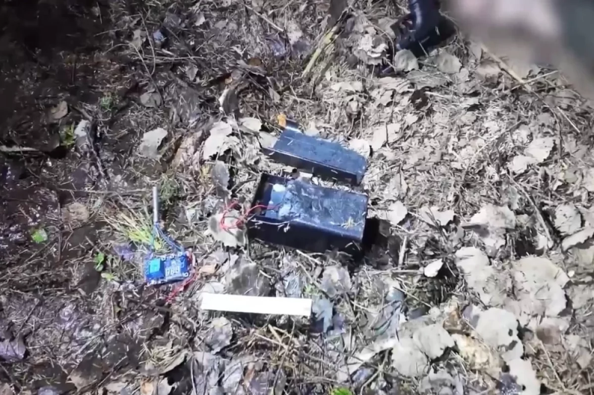 На кадрах видно, как оперативник в полном боевом снаряжении приближается к телу злоумышленника, лежащему на лесной подстилке у деревьев. Рядом было обнаружено закамуфлированное взрывное устройство, пистолет, лопатка и телефон. Освещая путь тактическим фонарём, силовик осматривает место инцидента.