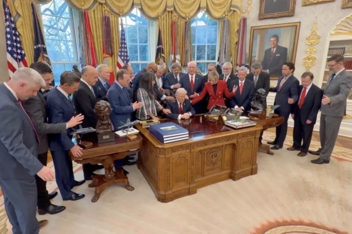 Лидер США Дональд Трамп вместе с пасторами со всей страны совершил коллективную молитву в Белом доме. Кадры этого события в соцсети X* разместил заместитель главы аппарата Белого дома Дэн Скавино.