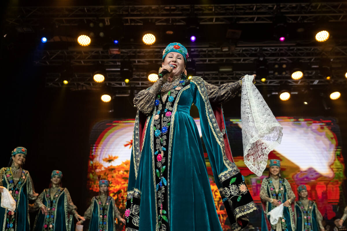 Каждый этап повествования дополнялся яркими танцевальными и вокальными номерами в исполнении Государственного ансамбля песни и танца РТ.