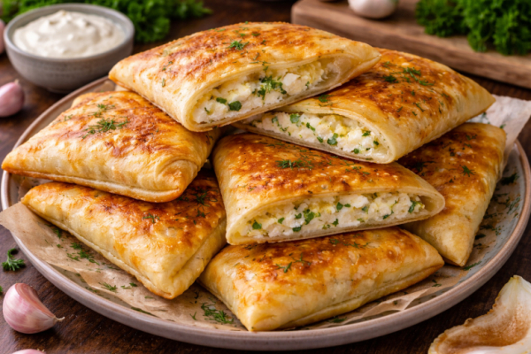 Золотистые, румяные конвертики с сочной начинкой из творога и сыра — простое блюдо, которое получается невероятно вкусным. Тонкое тесто становится слегка слоистым, а внутри — нежная, ароматная начинка с зеленью, которая буквально тает во рту.