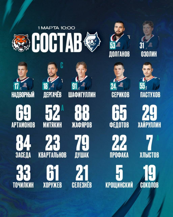 Нижнекамский «Нефтехимик» опубликовал состав на матч в Хабаровске с местным «Амуром». Игра начнётся в 10 часов на льду «Платинум Арены».